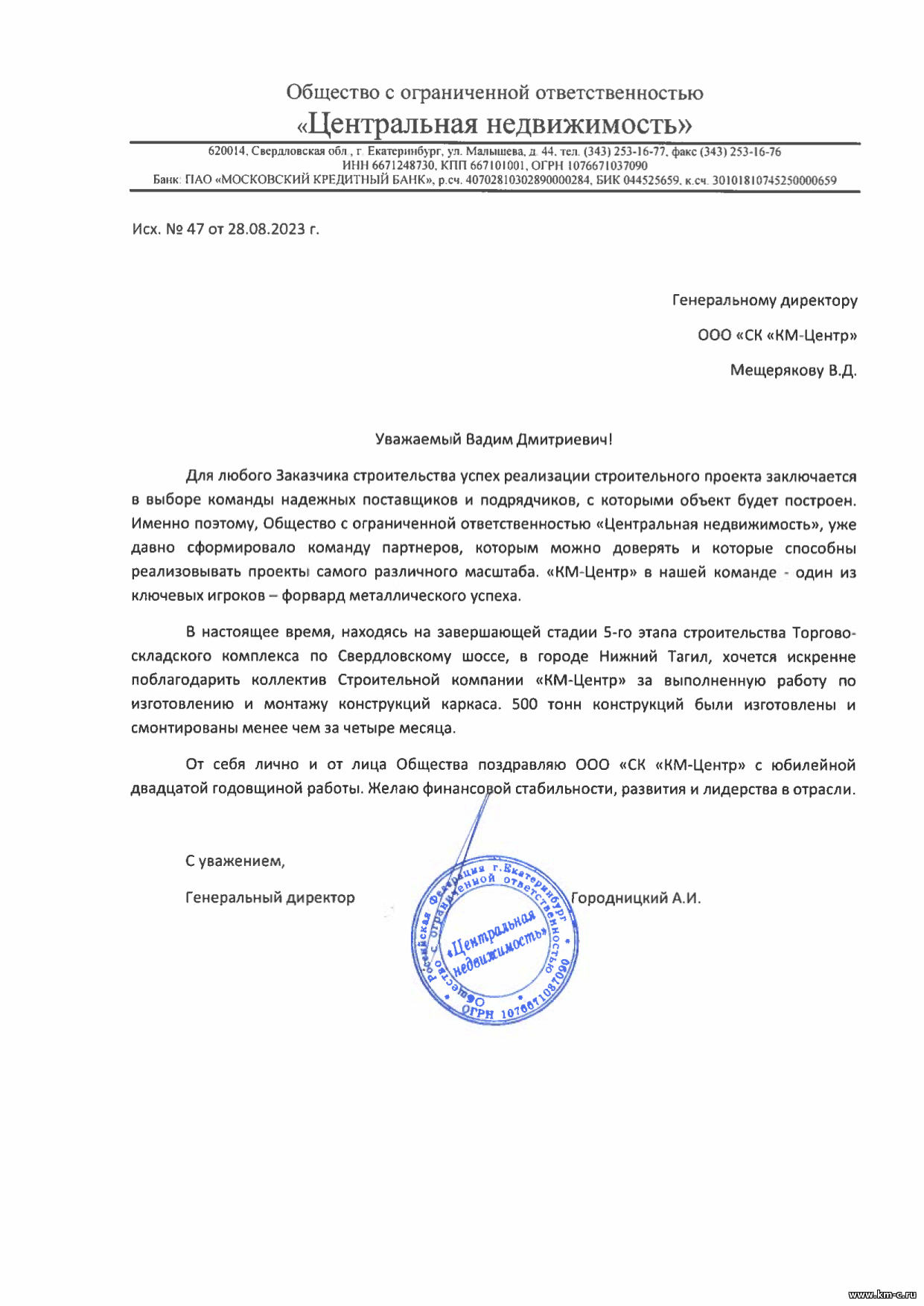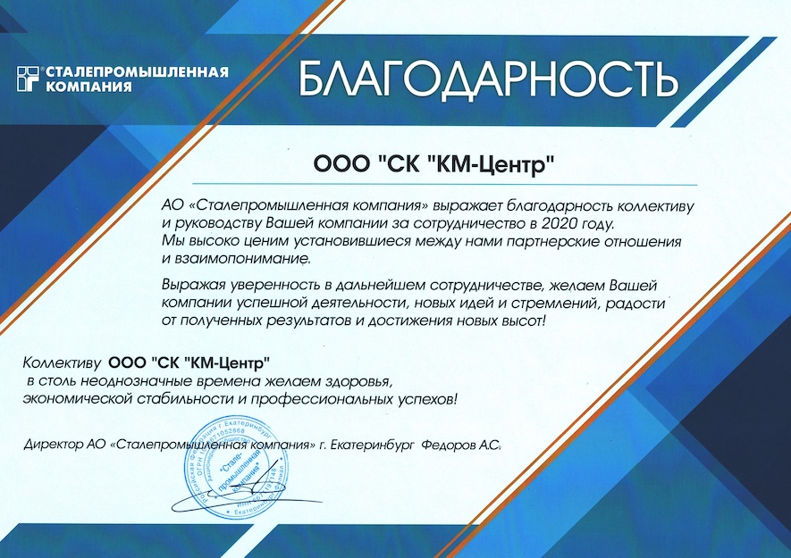 В настоящее время, находясь на завершающей стадии 5-го этапа строительства Торгово-складского комплекса по Свердловскому шоссе, в городе Нижний Тагил, хочется искренне поблагодарить коллектив Строительной компании «КМ-Центр» за выполненную работу по изготовлению и монтажу конструкций каркаса. 500 тонн конструкций были изготовлены и смонтированы менее чем за четыре месяца.
